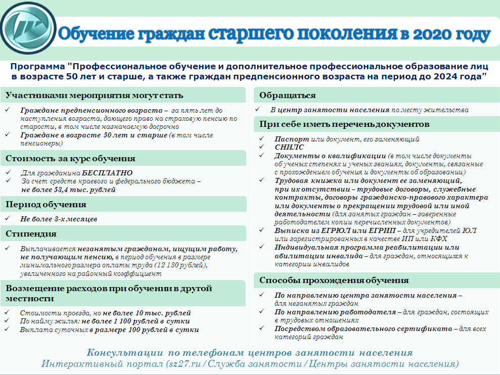 А в рамках федерального проекта «Старшее поколение» национального проекта «Демография» граждане в возрасте 50 лет и старше, граждане пред пенсионного возраста также имеют возможность пройти обучение. Более подробная инфорация размещена в буклетах, расположенных ниже.