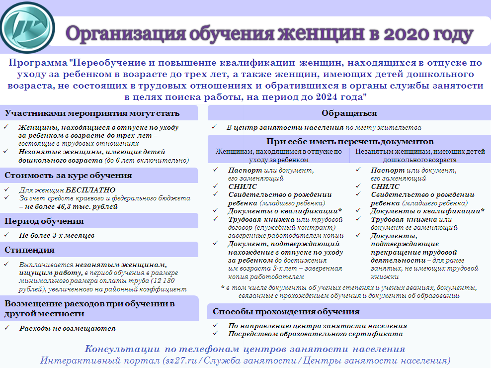 В соответствии с письмом Комитета по труду и занятости населения края от 10 февраля 2020 года № 16-12-1052 Вы имеете возможность участвовать в мероприятиях по профессиональному обучению и дополнительному профессиональному образованию в рамках федерального проекта «Содействие занятости женщин — создание условий дошкольного образования для детей в возрасте до трех лет» национального проекта «Демография».