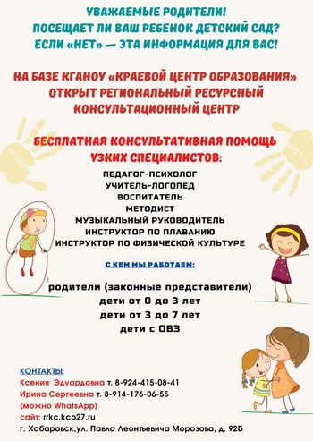 Информируем Вас о деятельности Регионального ресурсного консультационного центра по оказанию методической, психолого-педагогической, диагностической и консультативной помощи без взимания платы родителям с детьми с ограниченными возможностями здоровья, обеспечивающей получение детьми дошкольного образования в форме семейного образования, созданного на базе структурного подразделения дошкольного образования краевого государственного автономного нетипового образовательного учреждения «Краевой центр образования» (далее — ОВЗ, Региональный ресурсный консультационный центр, КГНОУ КЦО соответственно).