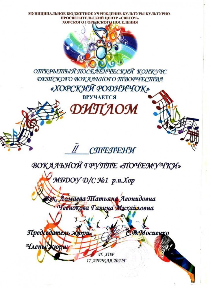 . От нашего детского сада участвовал квартет «Сказка» с песней «Бременские музыканты», коллектив «Музыкальные шкоды» с танцем «Военный вальс» и «Озорные девчонки» с танцем «Я возьму у мамы бусы». Музыкальные шкоды награждены дипломом 2 степени, все остальные получили дипломы за участие. Руководители: Чеснокова Галина Михайловна и Чеботарева Виктория Валерьевна.